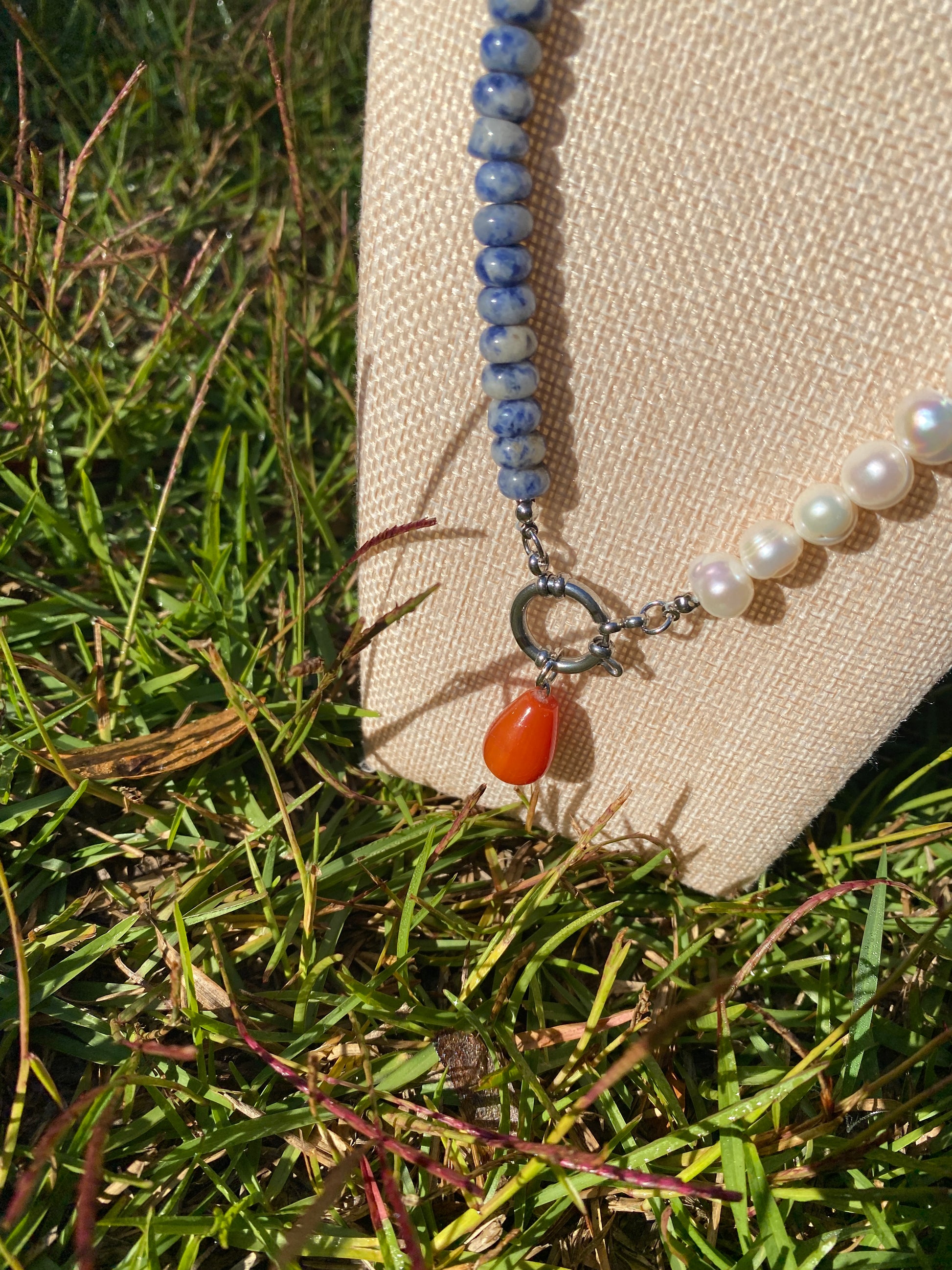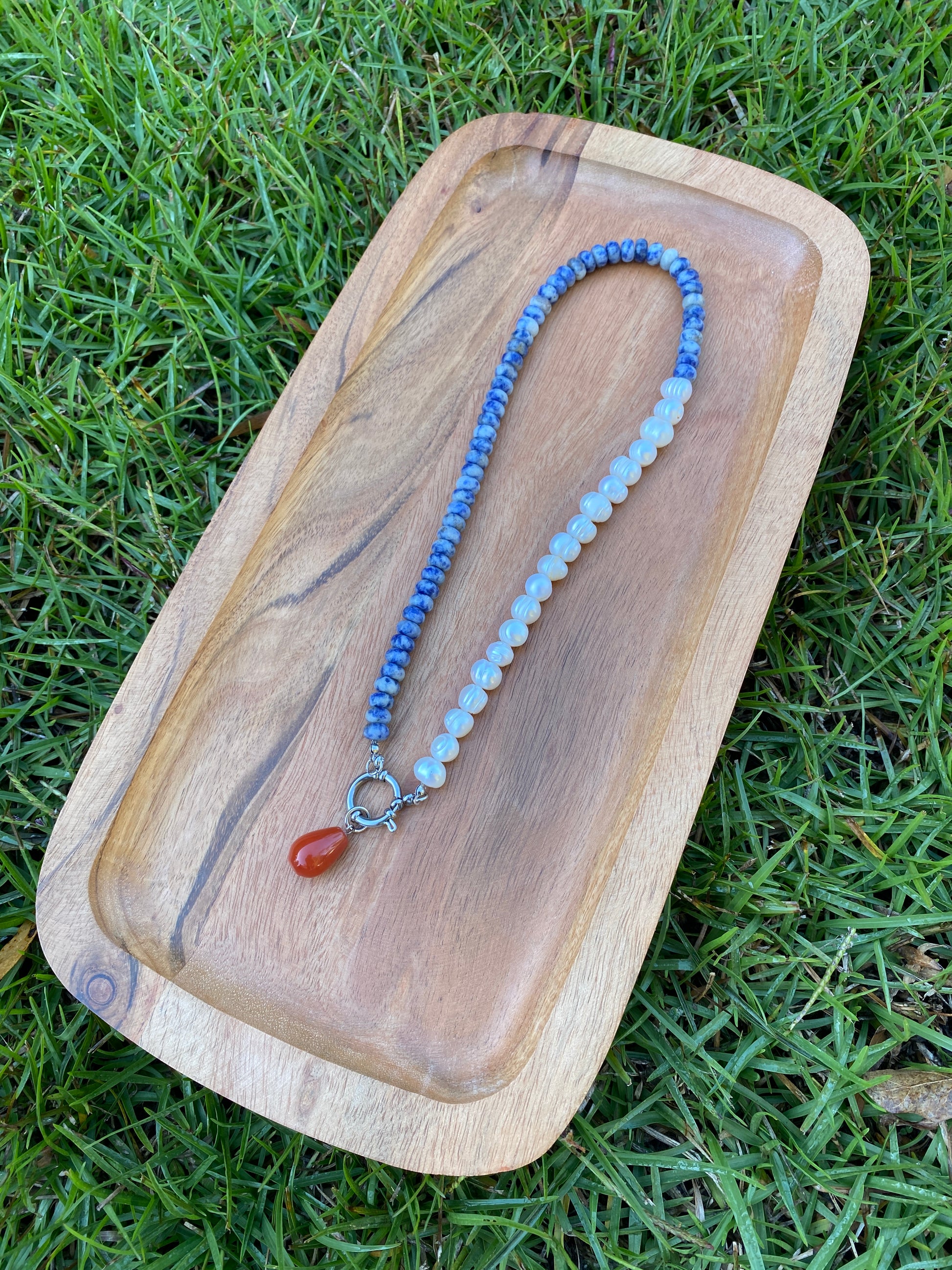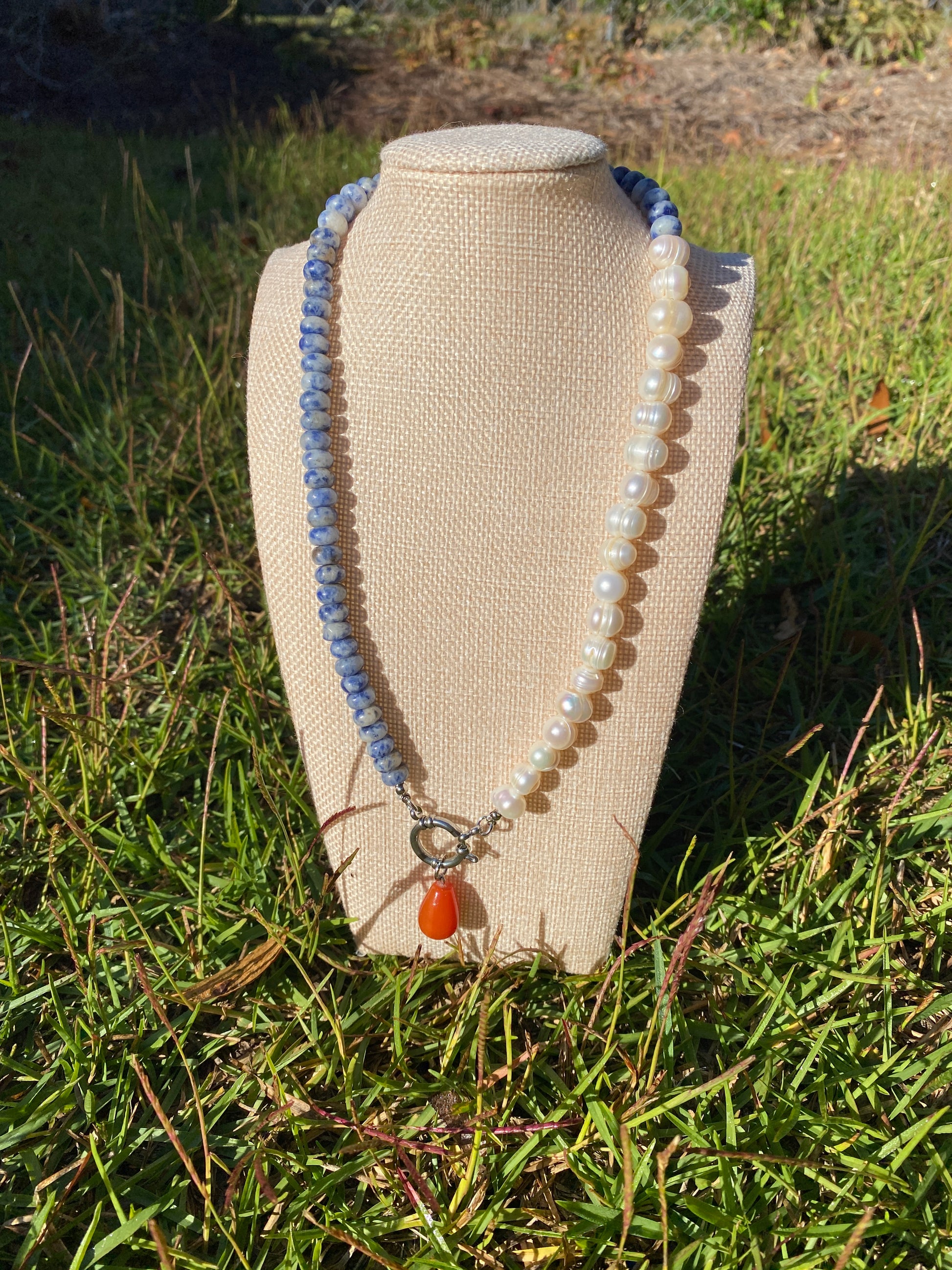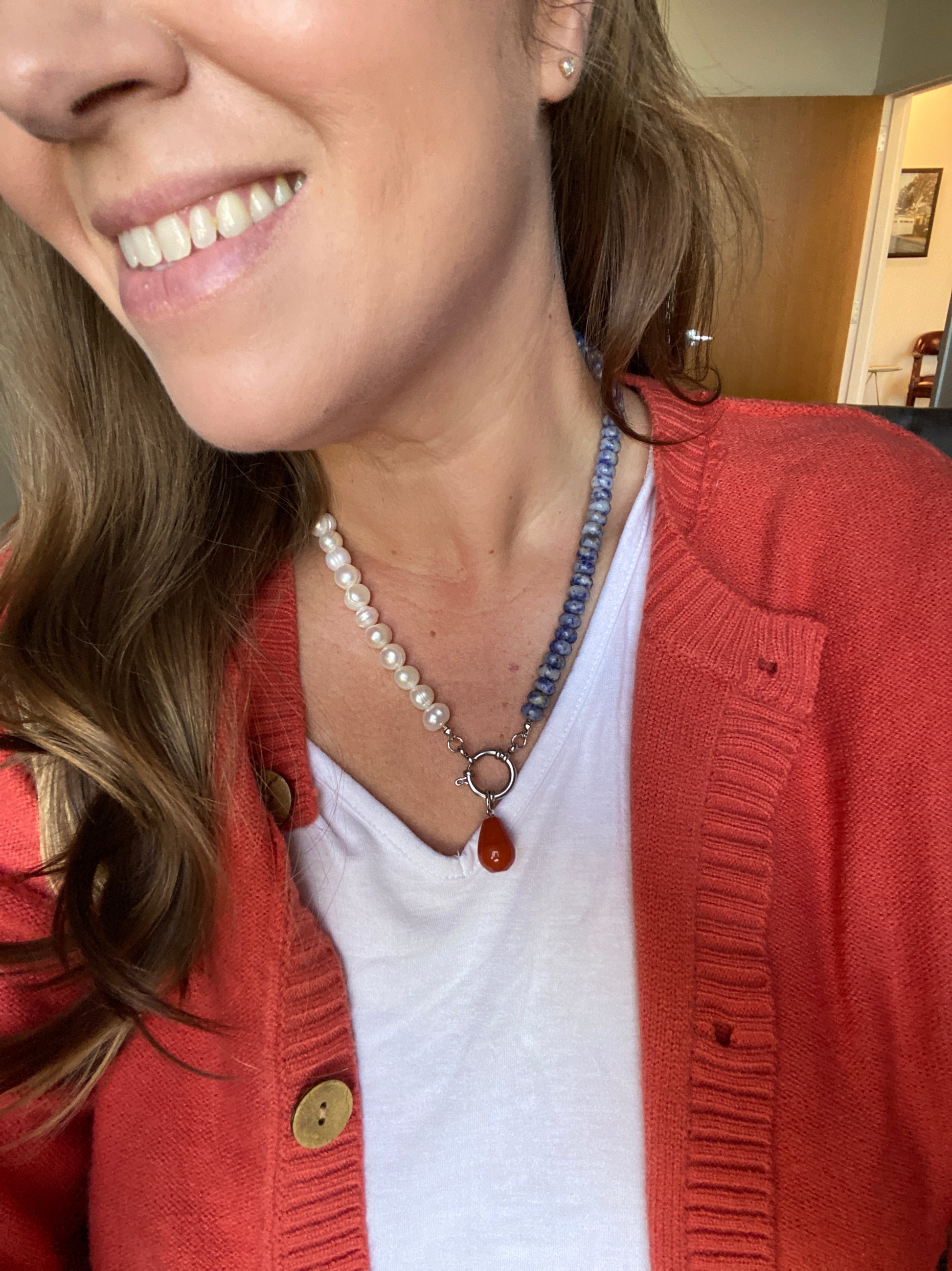 Amelia stuns with natural sodalite Rondelle beads and off round potato freshwater Pearl. Amelia is completed with a sterling silver sailor clasp.