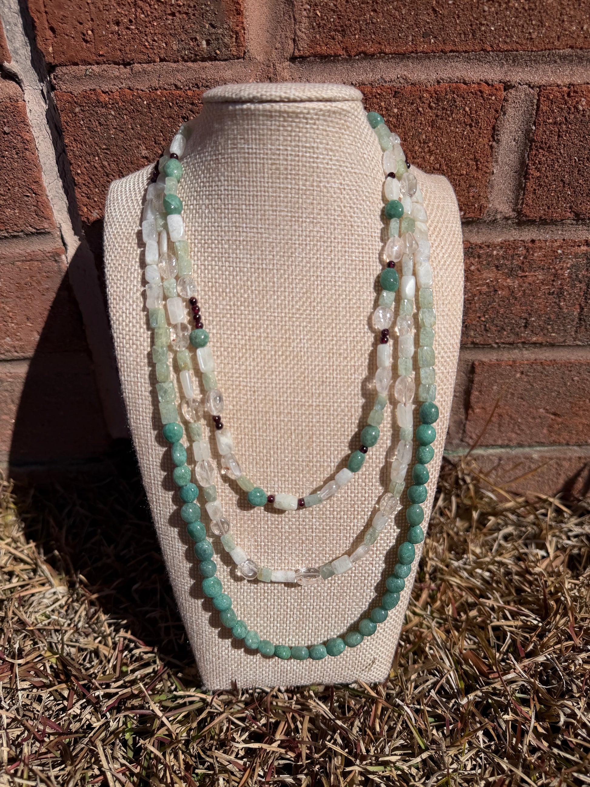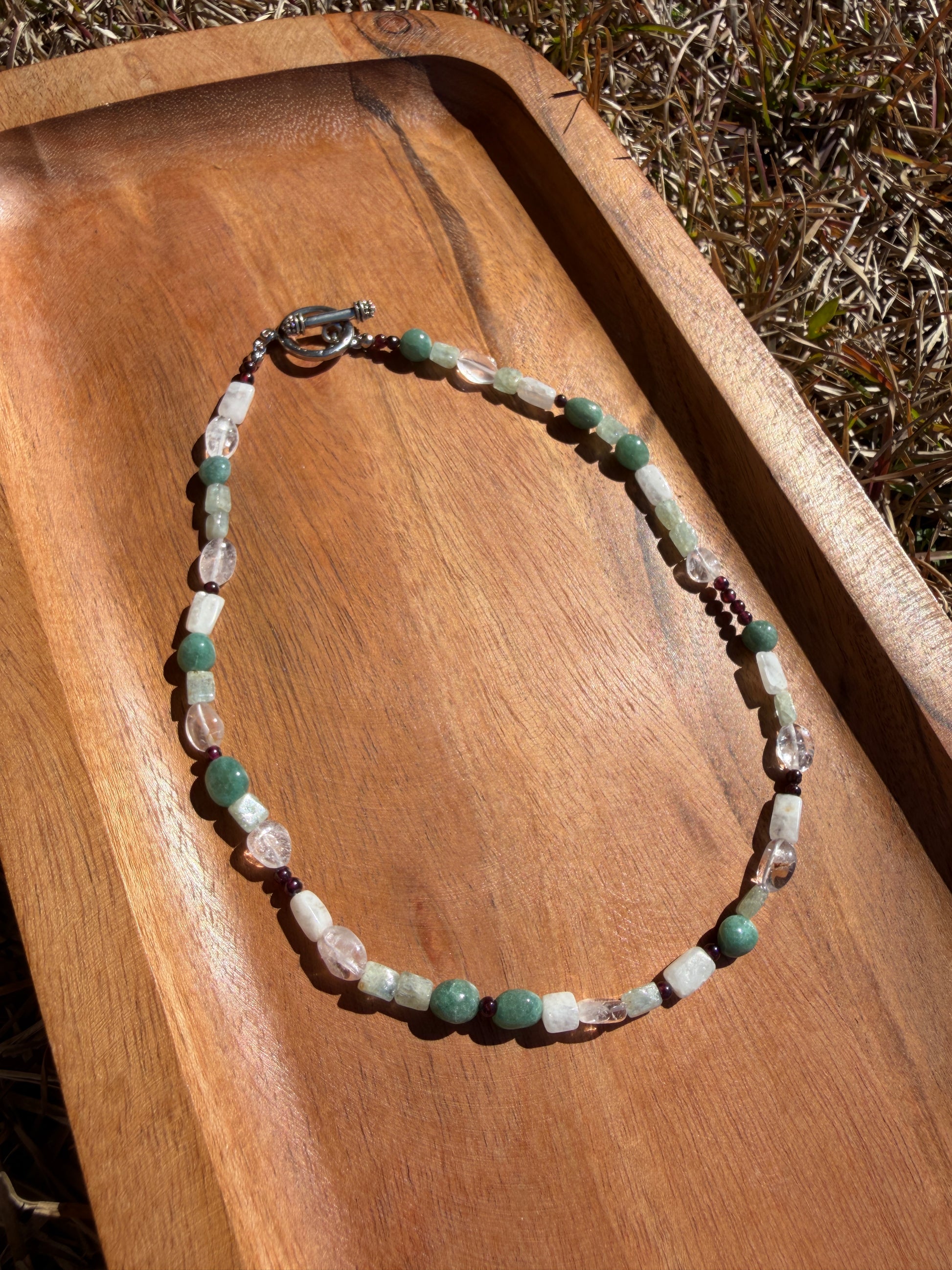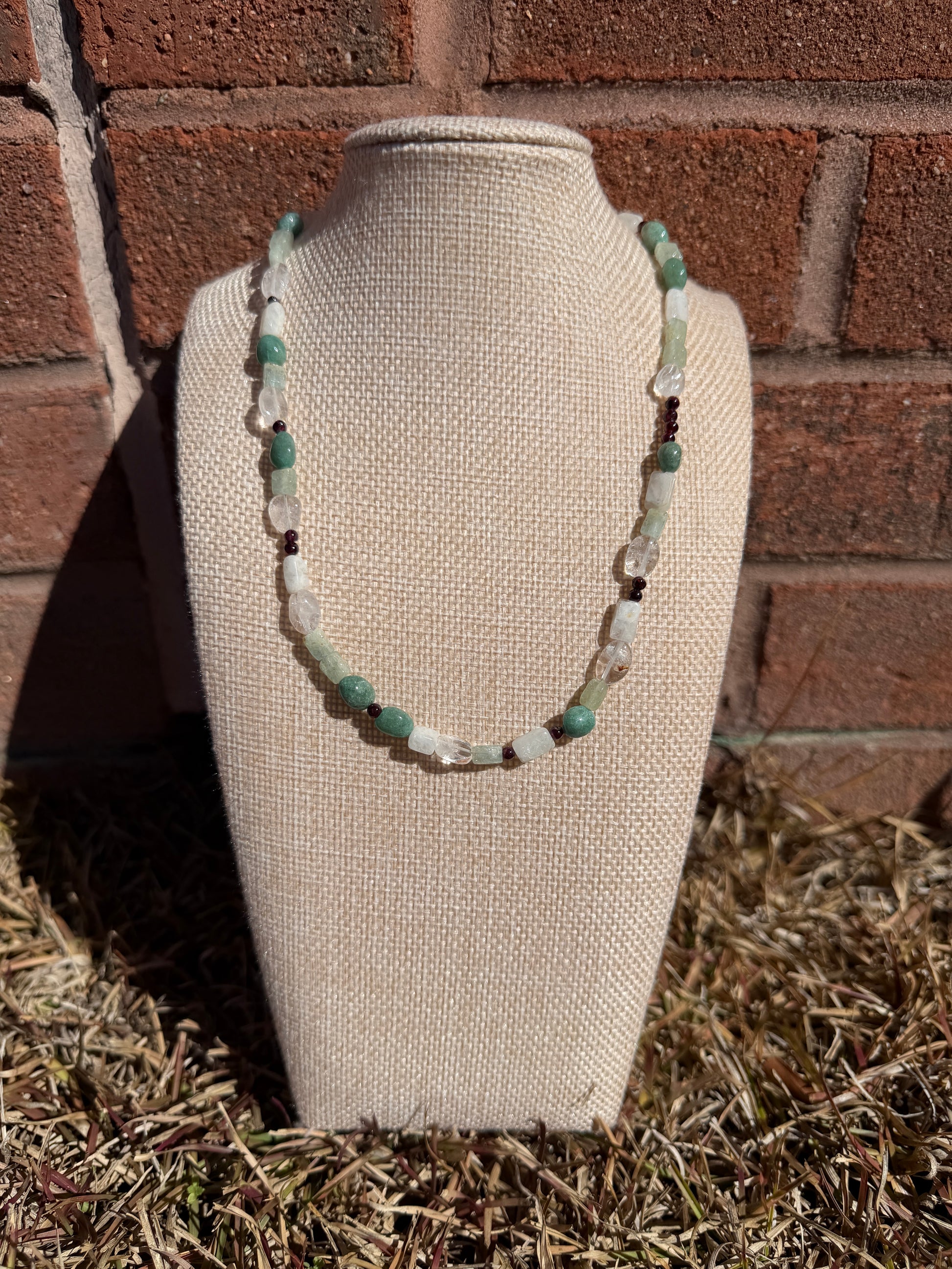 - milky quartz, garnet, green aventurine, and aquamarine stones,