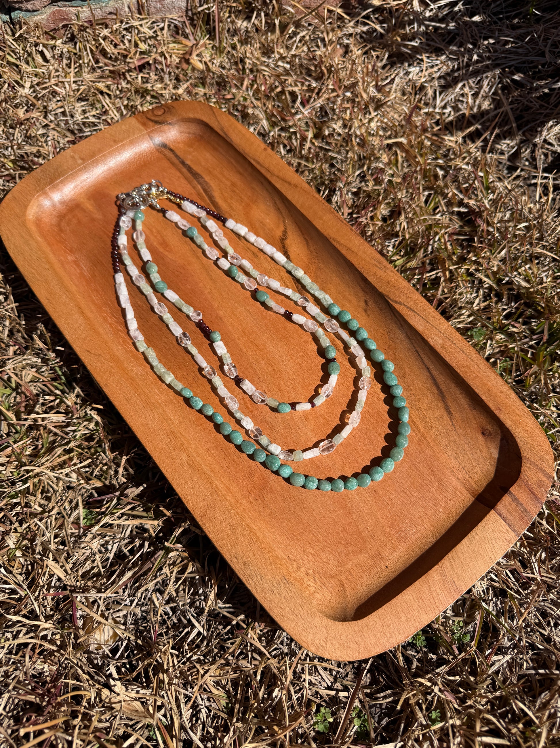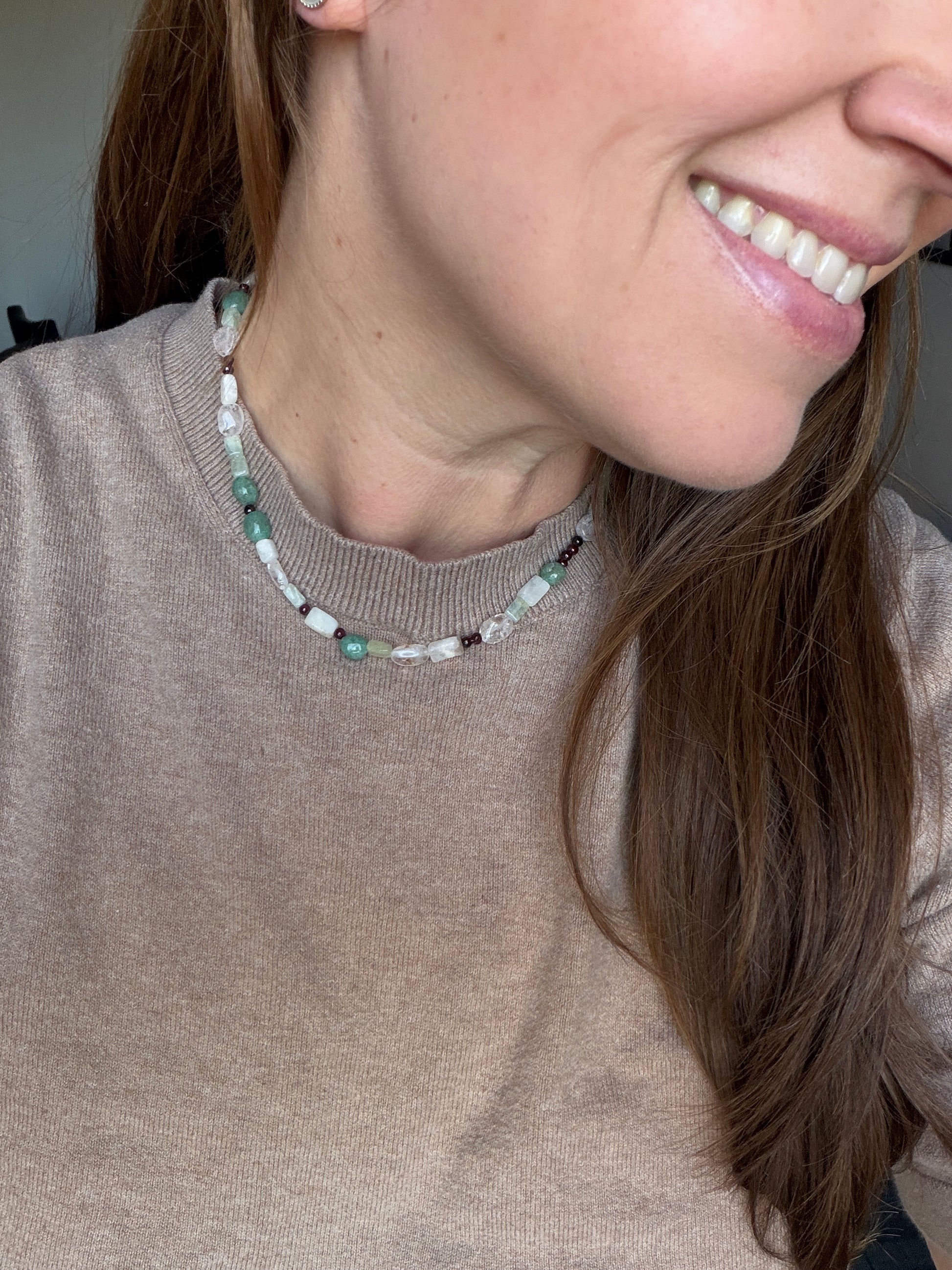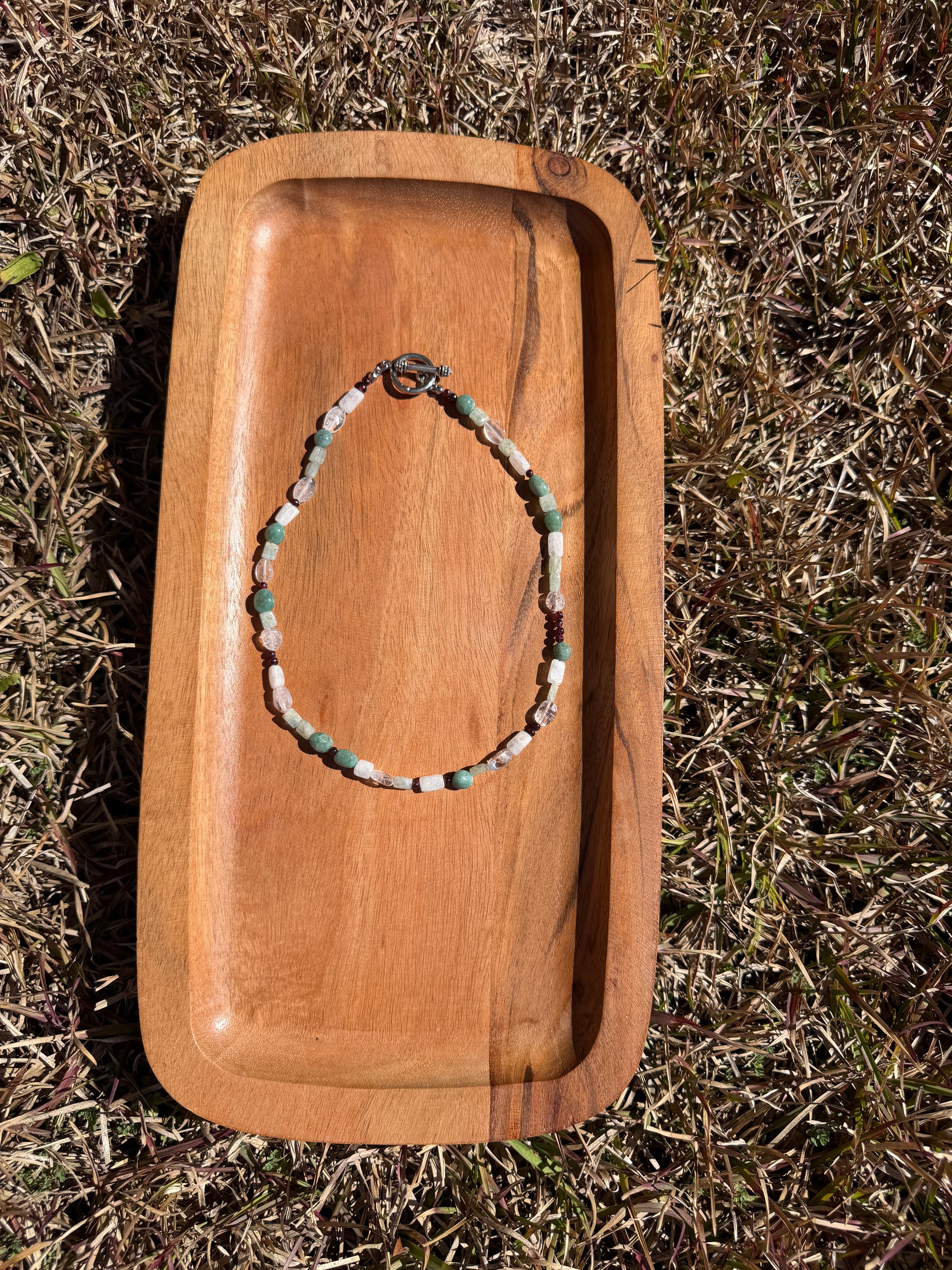 - milky quartz, garnet, green aventurine, and aquamarine stones,