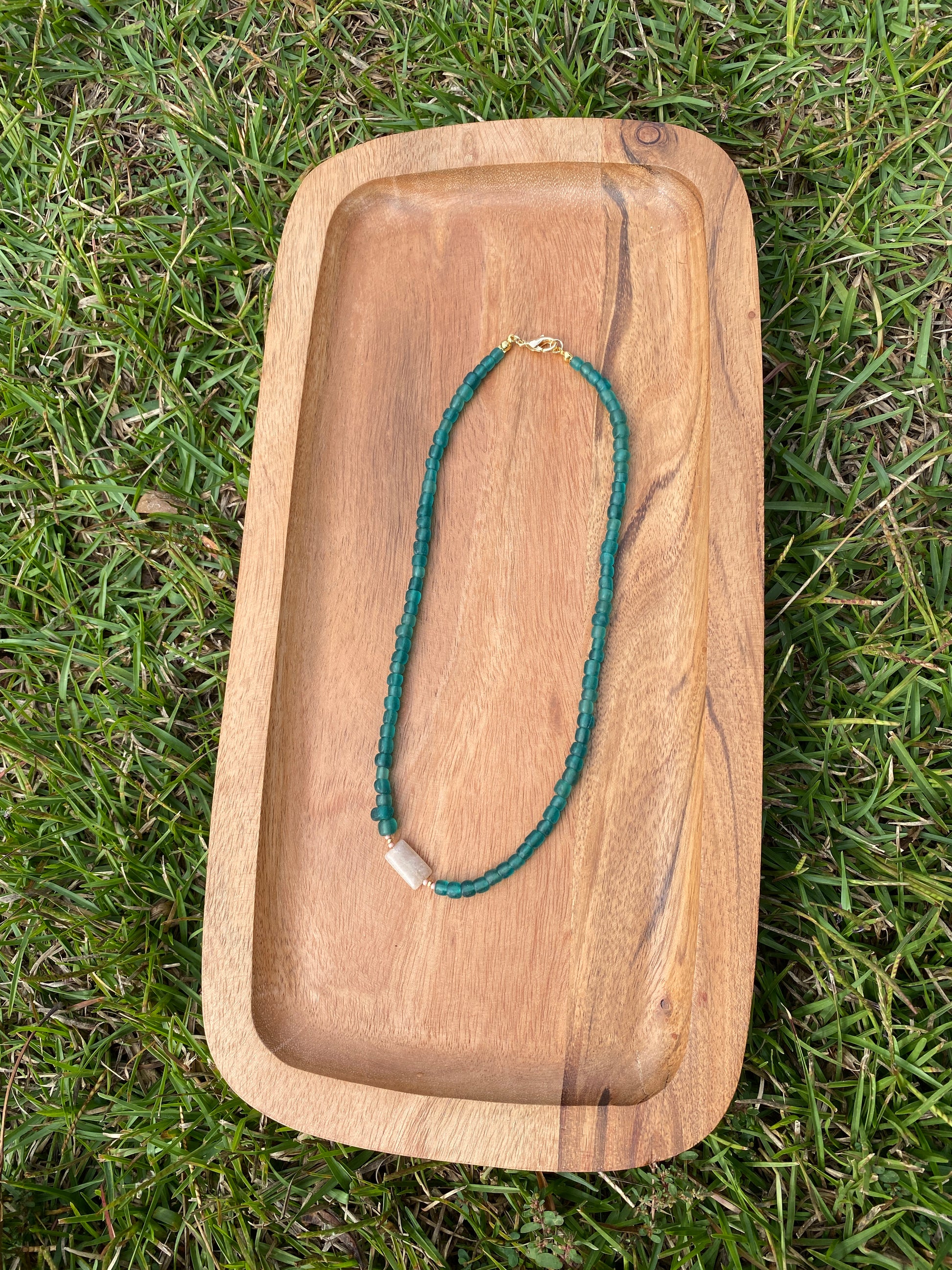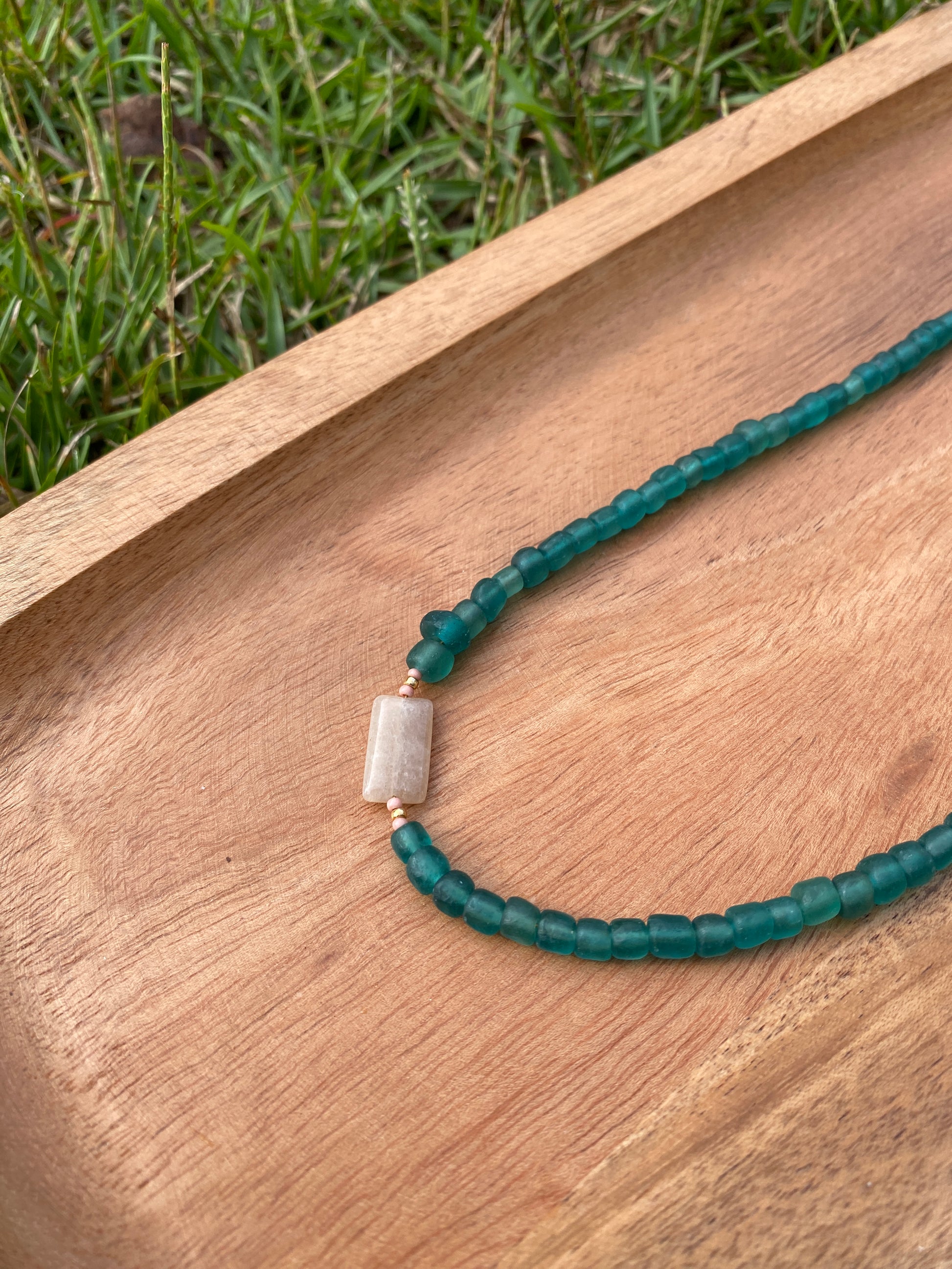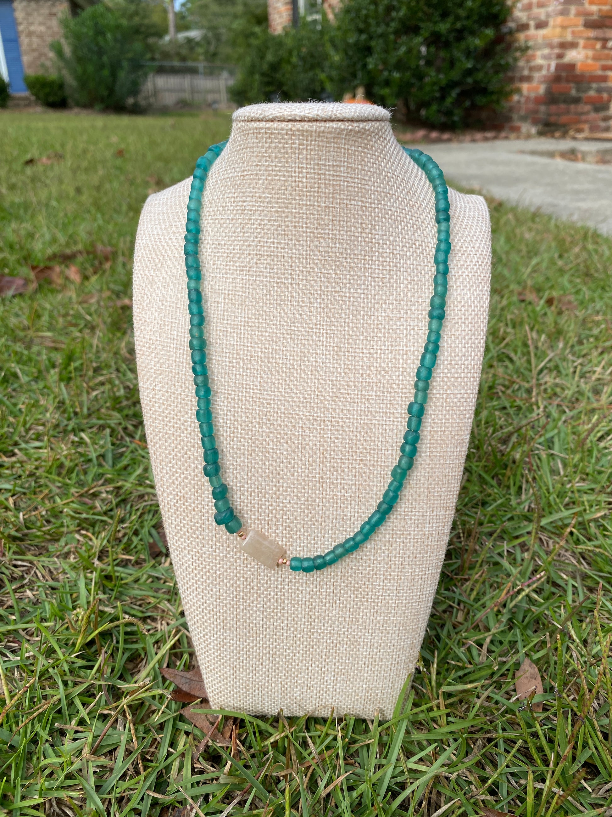 Seashore is made with Java glass beads, dyed Jade square bead, and gold filled spacer beads. The clasp is also gold filled.